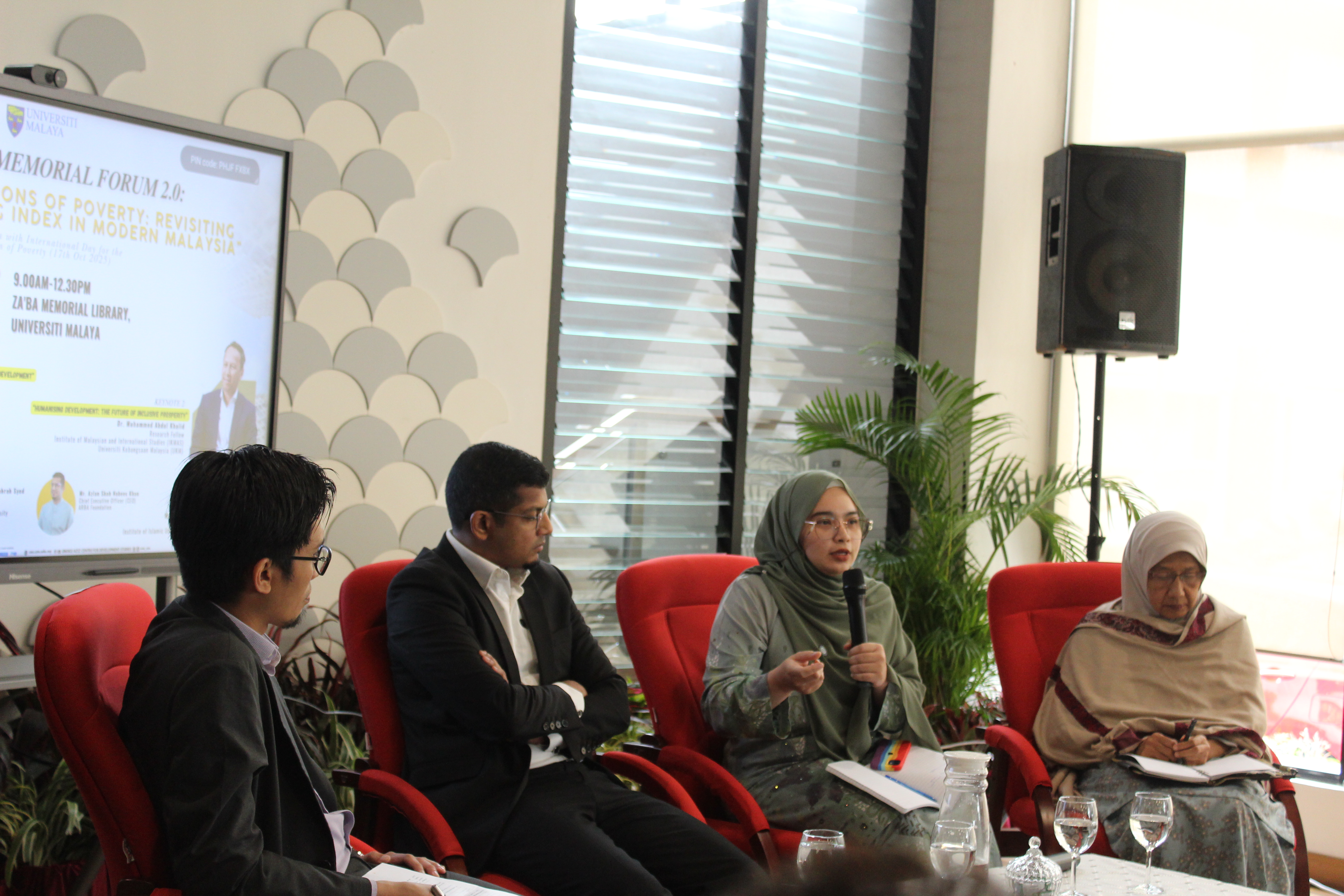 Sesi forum seterusnya menampilkan barisan panel yang terdiri daripada Prof. Dr. Fatimah Kari, Profesor Kehormat di Fakulti Ekonomi dan Perniagaan, Universiti Malaya (UM); Dr. Sharifah Fatimah Alzahrah Syed Hussein, Pensyarah Kanan di Universiti Islam Antarabangsa Malaysia (UIAM); serta Encik Azlan Shah Nabees Khan, Ketua Pegawai Eksekutif ARBA Foundation. Para panellis telah berkongsi pandangan dan pengalaman berharga dalam membincangkan isu kemiskinan daripada pelbagai dimensi sosial, ekonomi dan kemanusiaan.